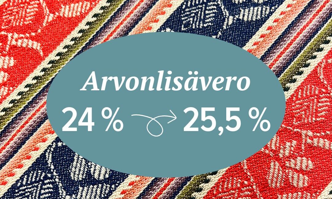 Arvonlisäveron korotus Suomessa astuu voimaan 1.9.2024 eli ihan pian. Mitä tämä tarkoittaa asioidessasi meillä tai verkkobutiikin puolella? Kuun vaihtuessa hinnat päivittyvät verkkokaupassamme ja järjestelmässämme veronkorotuksen verran ylöspäin. Yleinen verokanta nousee siis 24 prosentista 25,5 prosenttiin. Pidämme edelleen avoinna myös vaihtoehdon noutaa tilaus toimitiloistamme ja maksaa noudettaessa, mutta huomaathan, että noudon...