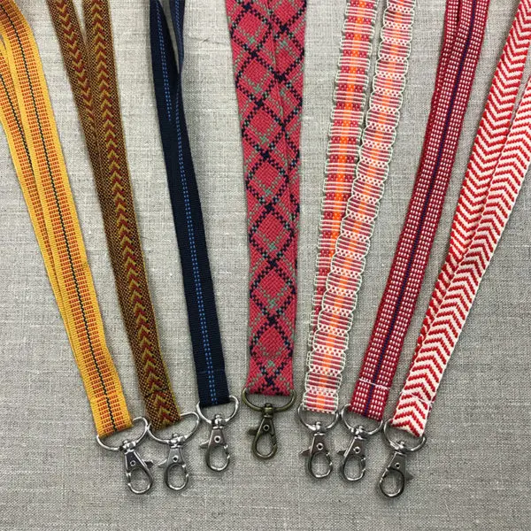 Kansallispuvun nauhasta valmistettu avainnauha. Nauhassa on papukaijalukko avainten tai kulkukortin kiinnitykseen ja niskassa turvalukko. Avainnauhan pituus niskasta lukon kärkeen n. 50 cm. Nauhat on kudottu ja ommeltu Suomessa.