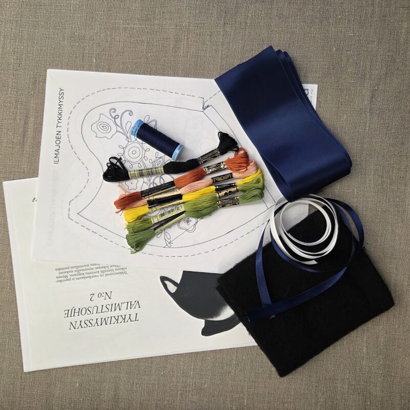 Pakkaus sisältää silkin, valmistusohjeen, kirjontamallin ja kirjontalangat, vatiinin, nauhat, silkkiompelulangan sekä yksivärinen rusettinauhan. Pakkaus ei sisällä myssykoppaa, niitä voit tilata koppien valmistajilta.