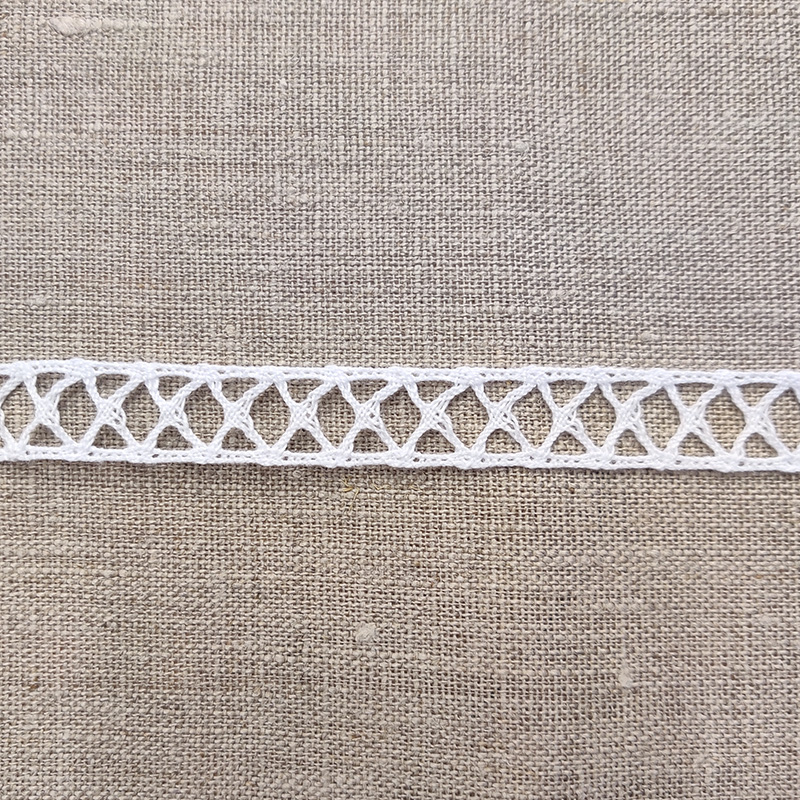 Teollinen pitsivaihtoehto Kokkolan ja Munsalan puvun esiliinaan. 100 % puuvillaa, leveys n. 1,3cm.