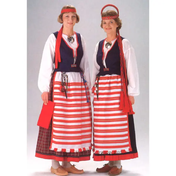 Rautjärven nyytinkiesiliinassa vuorottelee moniväriset käsinnyplätyt nyytingit ja puuvillainen esiliinakangas. Esiliina kiinnitetään vyötärölle sinisävyisellä villapunoksella. Huom. Kuvassa ei ole nyytinkiesiliina, vaan molemmilla naisilla on Rautjärven ripsiraitainen esiliina.