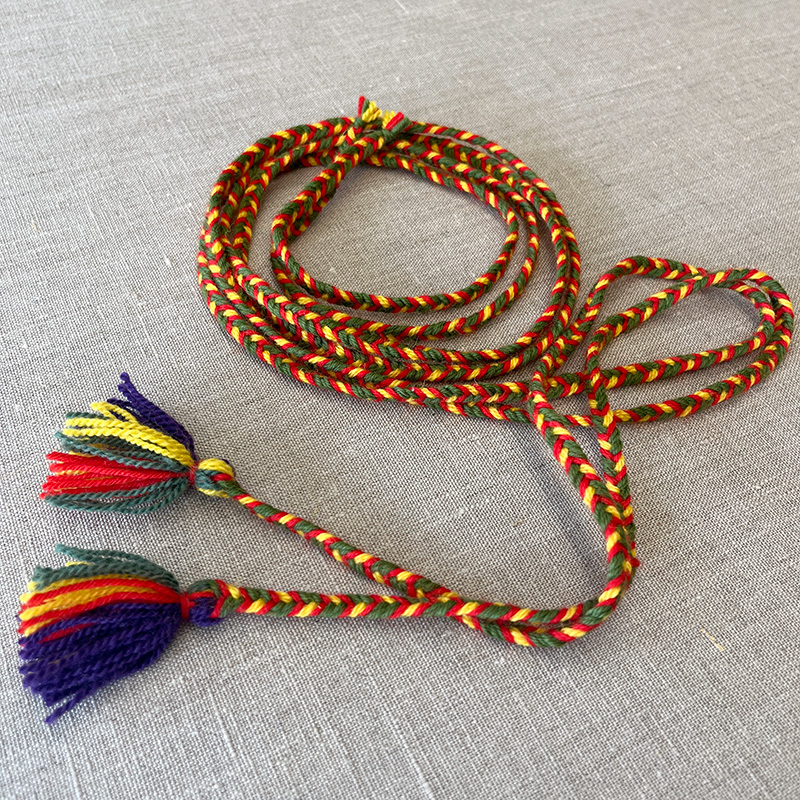 Valmiit esiliinan punotut vyönauhat, joiden päissä tupsut.