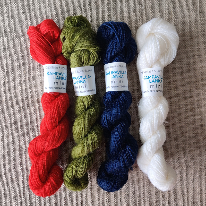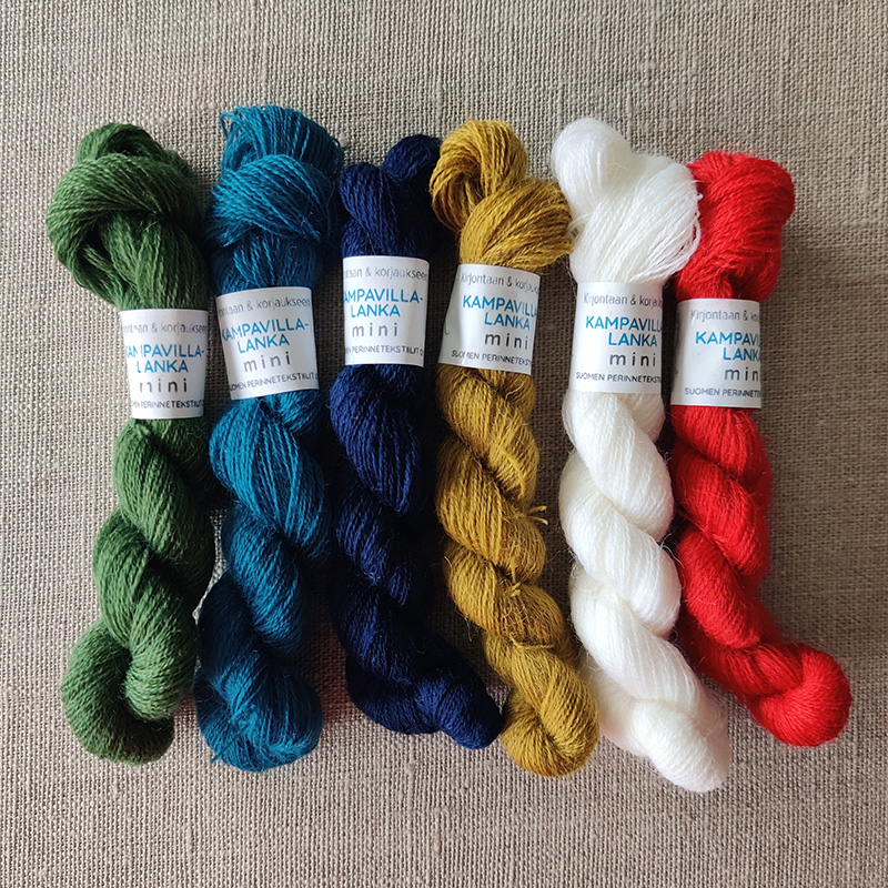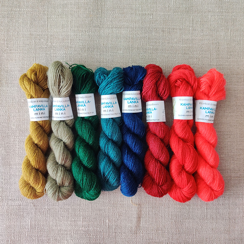 Tuote kansallispukukankaan korjaajalle ja parsijalle. Setissä on 100 m dokat Kampavillalankaa kankaan raitaväreissä.