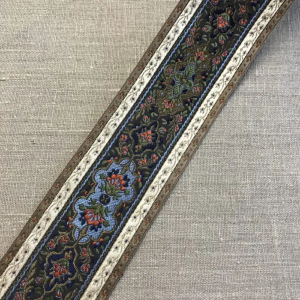 Ornamenttikuvioinen brokadinauha tykkimyssyjen rusetteihin, nauhan leveys 72 mm.