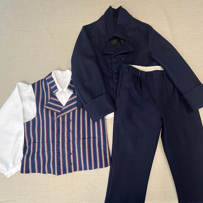 Pakkaus sisältää sinisen saran, vuori- ja tukikankaat, napit ja muut pientarvikkeet, ompelulangat, kaavat ja ohjeet. Kaava-arkilla on koot 48-56.