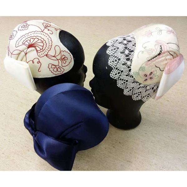Tarvitset myssyn kanssa vielä tykin, jossa on pieni kappale paitakangasta ja pitsi. Tykkiin sopivaa teollista pitsiä löytyy täältä, tarvittava määrä on 70 cm. Voit myös itse nyplätä soveltuvan pitsin. Täältä löydät Orimattilan pitsin ohjeen ja täältä langan (vahvuus Nel 60/2) tai floderipitsin ohjeen ja täältä langan. Langan vahvuus floderissa on Nm 50/2, Nel 80/2.