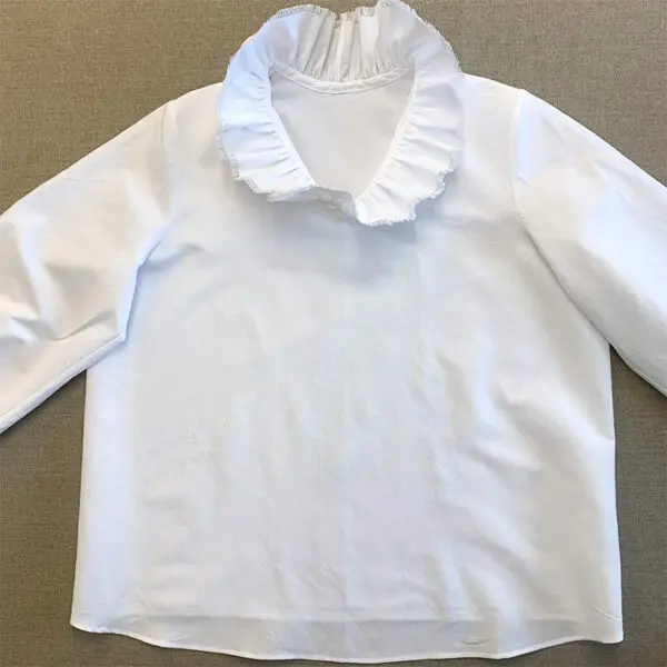 Pakkaus sisältää paitakankaan, kirjonta- ja ompelulangat, napit, kaavat ja ohjeen. Kaava-arkilla on koot 36-46.